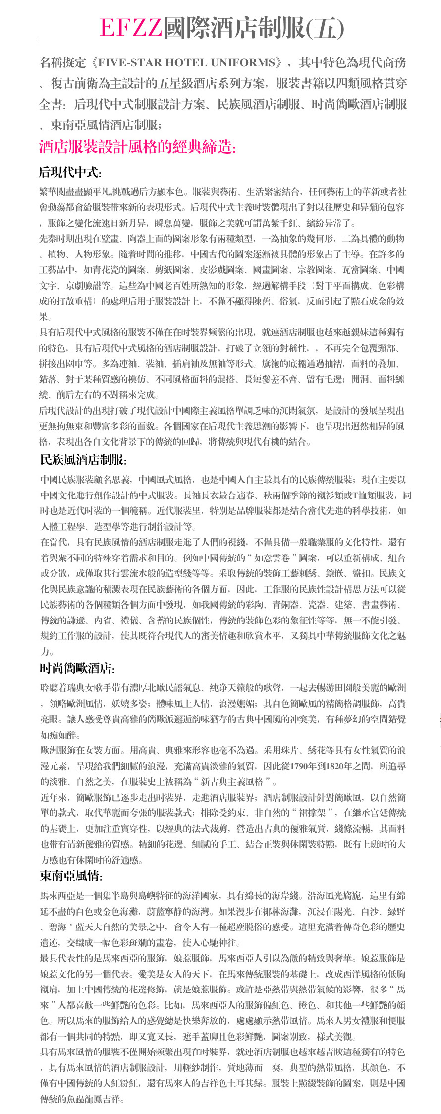 國際酒店制服(五)書籍,名稱擬定《Five-star hotel uniforms》,其中特色為現(xiàn)代商務(wù)、復(fù)古前衛(wèi)為主設(shè)計的五星級酒店系列方案,服裝書籍以四類風(fēng)格貫穿全書:后現(xiàn)代中式制服設(shè)計方案、民族風(fēng)酒店制服、時尚簡歐酒店制服、東南亞風(fēng)情酒店制服;