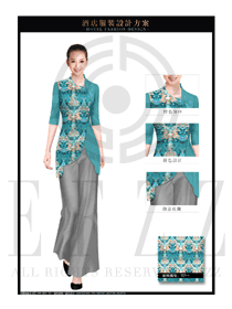 青綠色修身女款酒店中餐迎